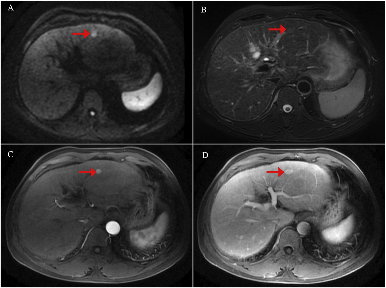 Initial contrast-enhanced liver magnetic resonance imaging (MRI) findings at the time of diagnosis. (A) Diffusion-weighted imaging (DWI) showing a focal area of restricted diffusion in the liver. (B) T2-weighted image demonstrating corresponding hyperintensity in the lesion. (C) Arterial phase of contrast-enhanced MRI revealing early enhancement of the lesion. (D) Venous phase image showing washout or delayed enhancement characteristics.