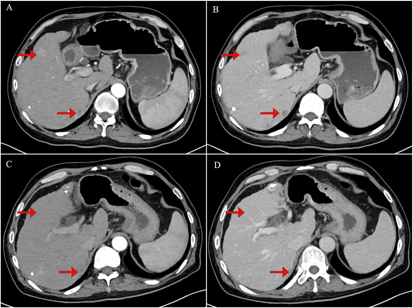 Contrast-enhanced abdominal computerized tomography (CT) scan images showing tumor recurrence and treatment response following crizotinib therapy. (A) Arterial phase image demonstrating a strongly enhancing nodule consistent with tumor recurrence. (B) Portal venous phase image showing persistent but slightly decreased enhancement of the lesion. (C) Arterial phase image obtained 1 month after initiation of crizotinib therapy, showing tumor shrinkage and reduced arterial enhancement of the nodule. (D) Portal venous phase post-treatment image demonstrating further tumor shrinkage with near-complete resolution of nodule enhancement.