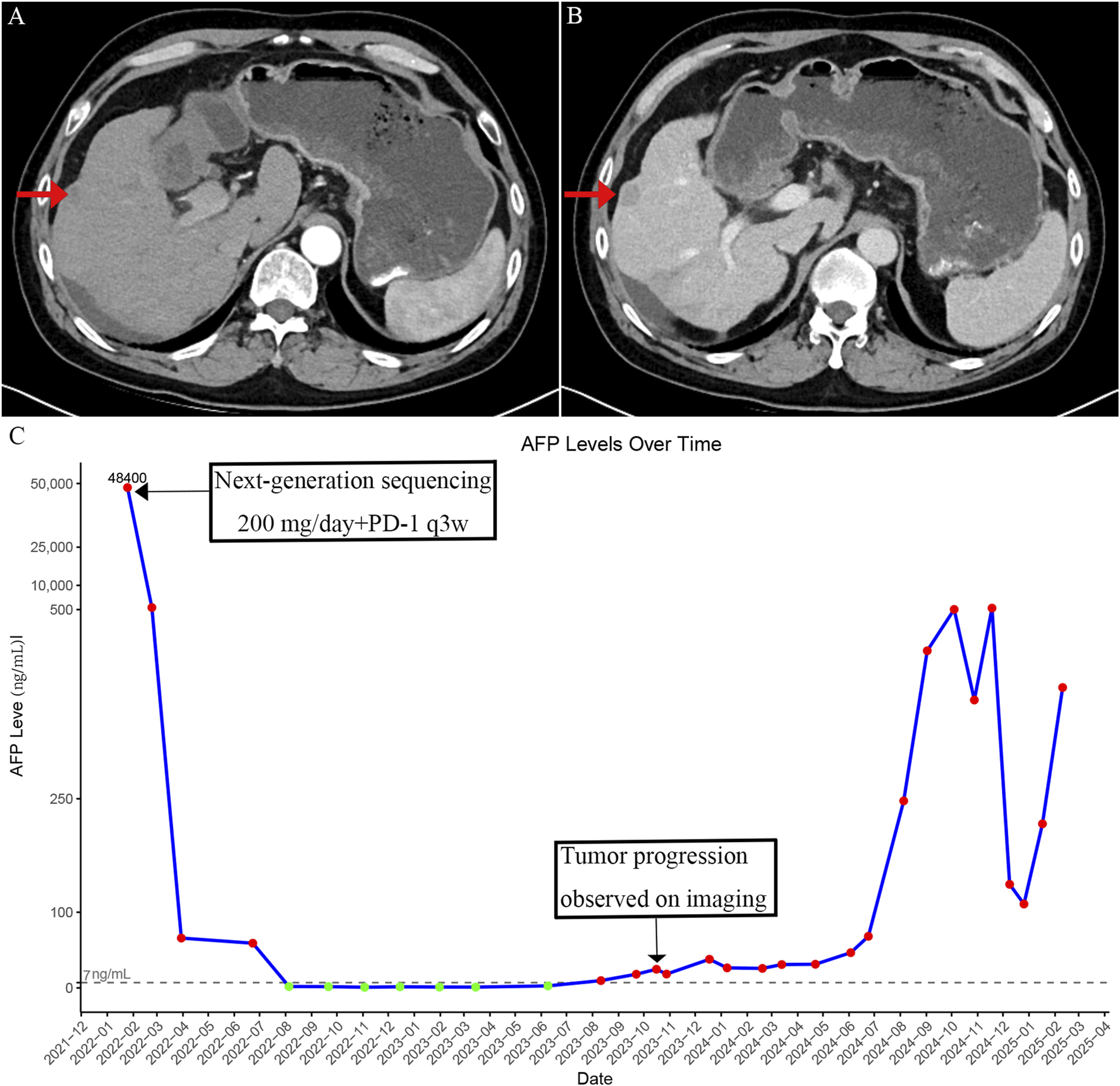 Unfortunately, after approximately 18 months of disease stability, a gradual and sustained increase in AFP was observed, eventually exceeding the normal range by August 2023 (Figure 3C). Imaging confirmed the emergence of new intrahepatic lesions (Figures 3A,B). In February 2025, a biopsy of the new hepatic lesion was performed, and NGS was repeated. However, no actionable mutations were identified (Table 2). Literature review suggests that resistance to MET-TKIs may be associated with specific mutations. MET-TKIs are classified into type I and type II inhibitors based on their binding modes to the ATP-binding pocket. It has been reported that mutations such as MET Y1230H confer resistance to type I MET-TKIs—including crizotinib, capmatinib, and tepotinib—but retain sensitivity to type II MET-TKIs, such as glesatinib and cabozantinib (Engstrom et al., 2017). Switching from a type I to a type II MET-TKI has been proposed as a strategy to overcome acquired resistance, especially in non-small cell lung cancer (NSCLC) (Cai et al., 2021). Despite the theoretical benefit, the patient was unable to afford cabozantinib due to its high cost and declined this treatment option. Subsequent treatments—including additional sessions of TACE and RFA, as well as changes in systemic therapies—yielded only temporary reductions in AFP levels, which quickly rebounded (Figure 3C). As of the latest follow-up, the patient remains alive but with persistent and uncontrolled disease activity. The most recent AFP level measured was 568 ng/mL.