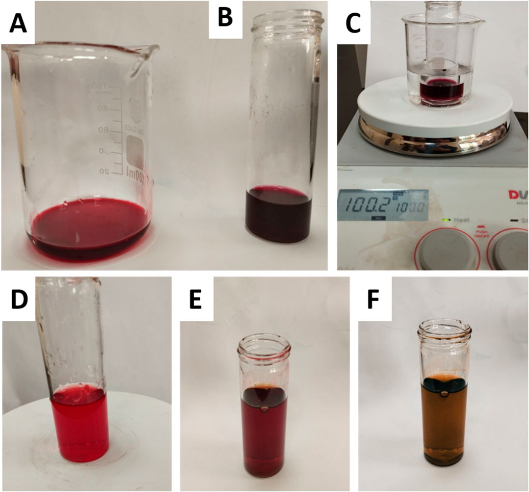 Figure 1. Colorimetric analysis of plant extract pigments under acidic and alkaline conditions. (A) untreated extract, (B) extract + HCl (acidic conditions), (C) extract + HCl after heating for 5 min (stability test under acidic heat), (D) untreated extract, (E) extract after dropwise addition of NaOH (transition to alkaline pH), and (F) extract after full addition of 3 mL NaOH (final alkaline conditions).