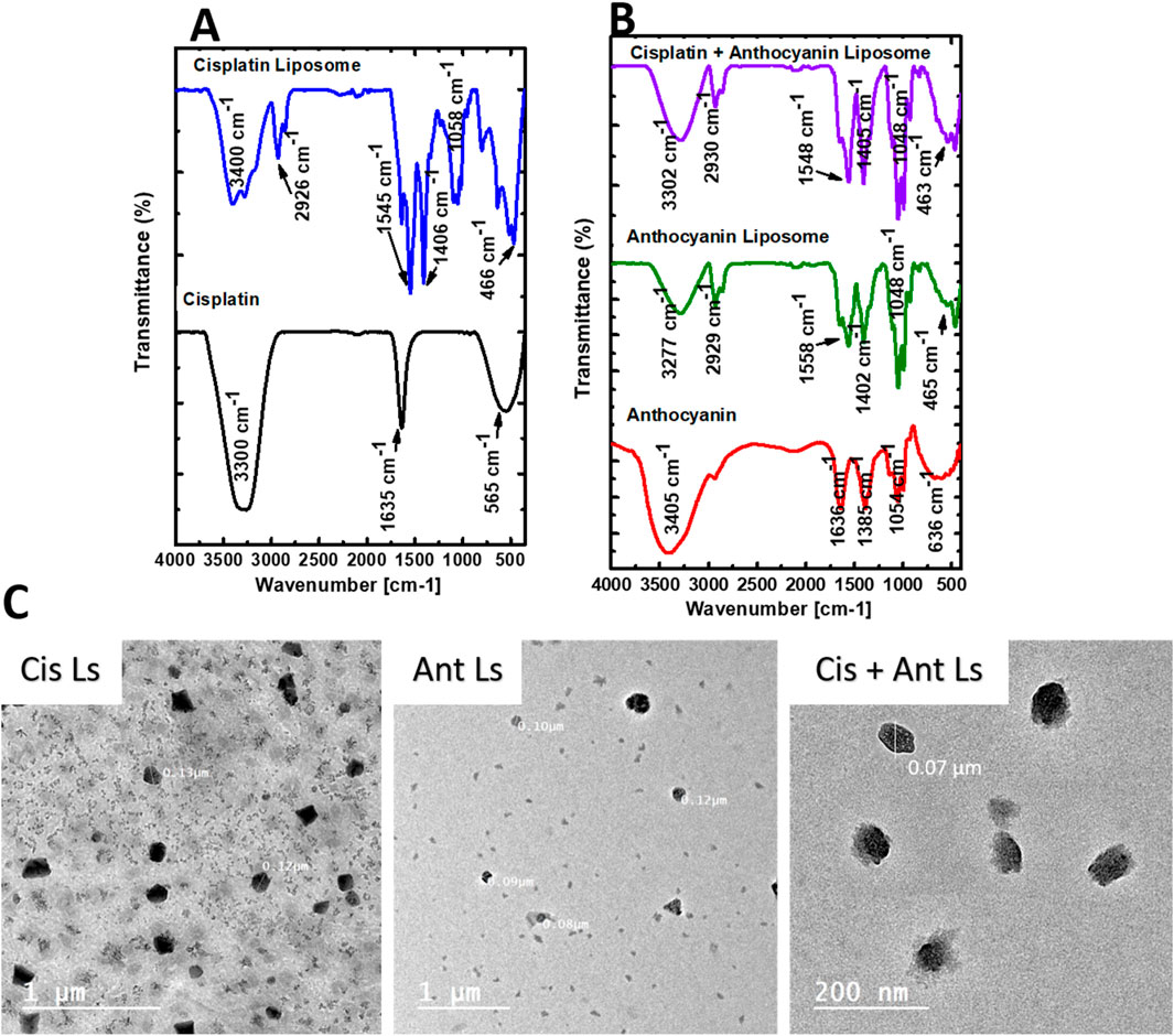 Figure 2. Characterization of Ant, Cis, and their Ls by FT-IR spectra and Transmission electron microscopy (TEM). (A) FT-IR spectra of Cis and Cis Ls. (B) FT-IR spectra of the Ant extract, Ant Ls, and Cis + Ant Ls. (C) TEM analysis reveals that the synthesized liposome nanoparticles (Cis Ls, Ant Ls, and Cis + Ant Ls) exhibit a size range of 70–130 nm.