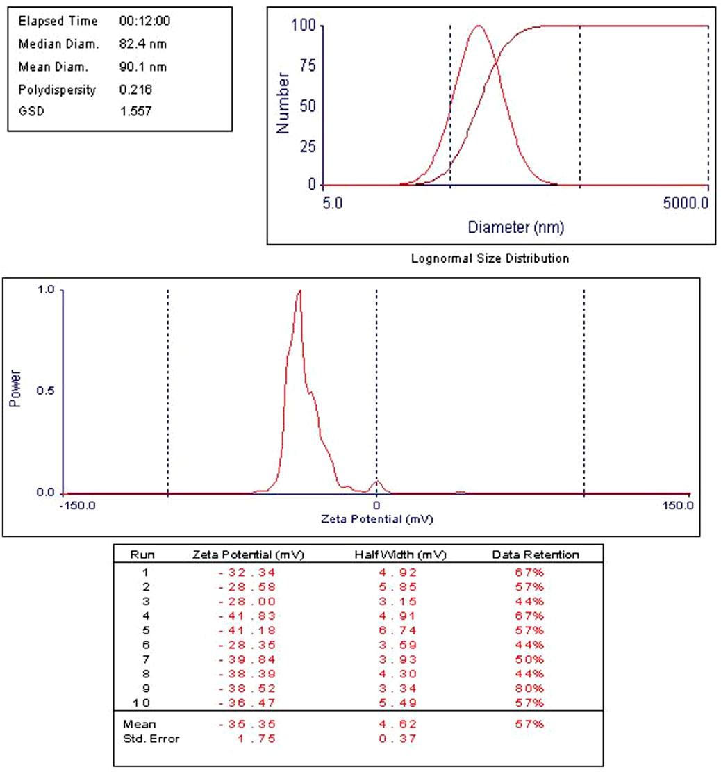 The time-dependent release profiles of Cis, Ant, or Cis + Ant from different formulations demonstrated significant variations among treatment groups. The Cis Ls group exhibited a gradual release pattern, reaching 12.17% ± 1.35% at 1 h, 13.75% ± 2.12% at 2 h, and progressively increasing to 34.16% ± 1.74% by 48 h. In contrast, the Ant Ls group showed markedly enhanced release kinetics, with percentages escalating from 8.97% ± 1.65% at 1 h to 59.11% ± 1.87% at 48 h, representing the most substantial cumulative release among all groups. The combination group (Cis + Ant Ls) displayed intermediate release characteristics, maintaining lower but sustained release values throughout the study period (3.82% ± 1.21% at 1 h to 13.68% ± 1.30% at 48 h) (Figures 3C–F). Comparative analysis revealed that all liposomes achieved substantially high release rates. The current data further extends these observations, with the Ant Ls group showing superior release performance, reaching nearly 60% cumulative release by 48 h. Anthocyanin-loaded liposomes showed a mean size of 90 nm and a strong negative zeta potential (−35.35 ± 1.75 mV) as shown in Figure 4.