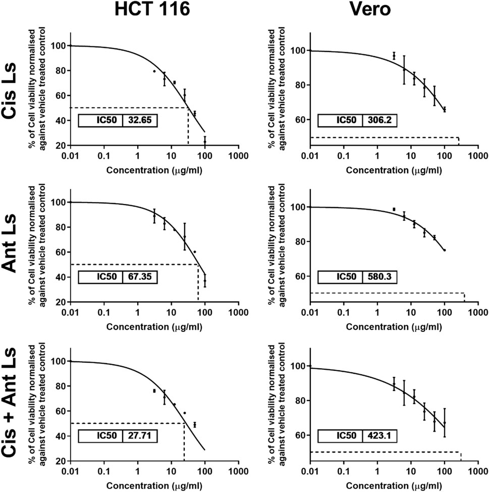 3.5 Impact of Ant Ls and/or Cis Ls on the viability of HCT 116 and vero cells
