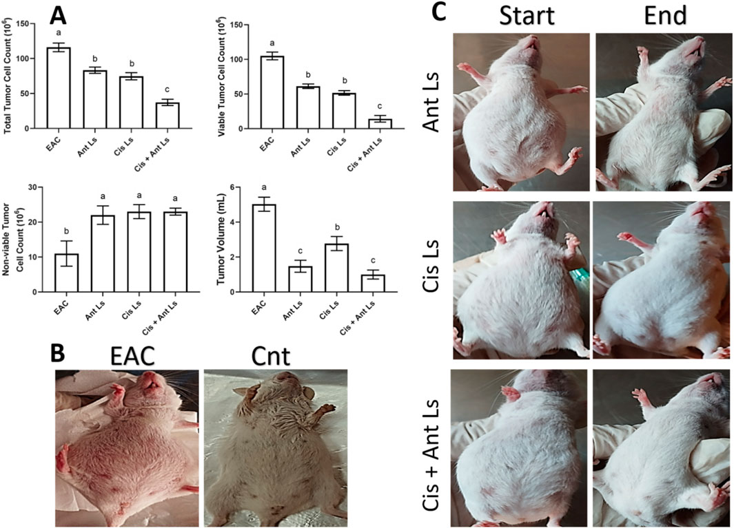 Figure 6. Effect of Ant Ls, Cis Ls, and Cis + Ant Ls treatments of EAC burden. (A) The effect of treatments on total tumor cell count, viable and non-viable tumor cell count, and tumor volume. Results were expressed as mean ± SEM (n = 7). Columns carrying different letters are significantly different [a (highest value) - c (lowest value)], denoting significant differences at P < 0.05. (B) Images of mice in the EAC and control (Cnt) group. (C) Images of mice in Ant Ls, Cis Ls, and Cis + Ant Ls groups, before and after treatment.