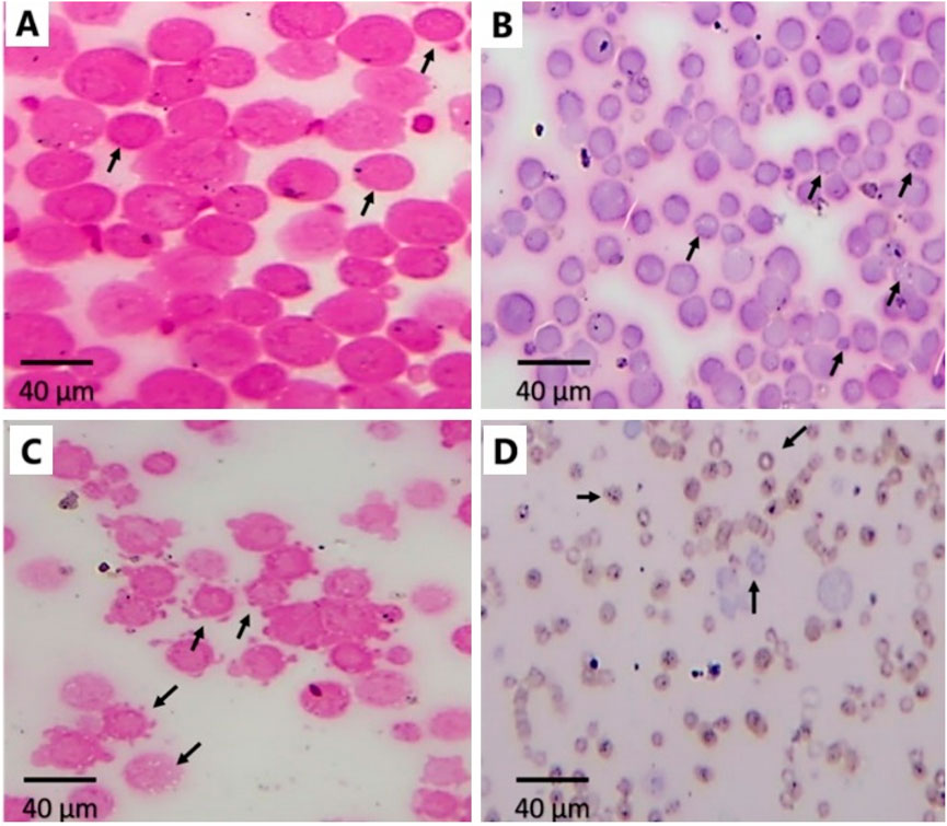 Figure 7. Effect of Ant Ls and/or Cis Ls treatments on EAC. Optical detection of apoptosis using H&E staining in untreated EAC cells (A), EAC cells treated with Cis Ls (B), EAC cells treated with Ant Ls (C), and EAC cells treated with Cis + Ant Ls (D). Arrows refer to normal round viable EAC cells (A) and apoptotic EAC (B–D).