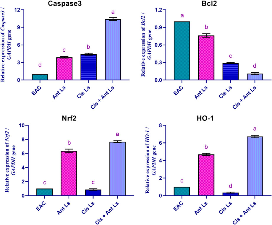 Figure 8. Effect of Ant Ls, Cis Ls, and Cis + Ant Ls treatments on relative mRNA expressions of Caspase3, Bcl2, Nrf2, and HO-1 in EAC cells. Values are given as mean ± SEM (n = 3/group). Various letters [a (highest value) - d (lowest value)] denote significant differences at P < 0.05. All groups were compared to each other.