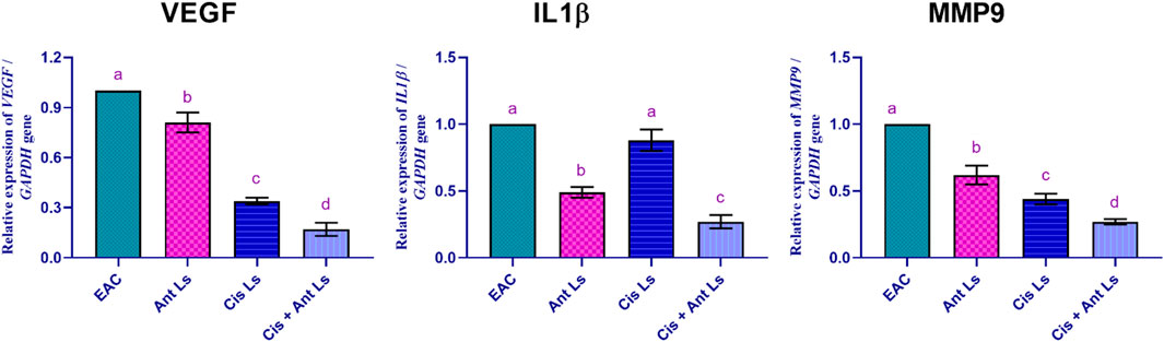 Figure 9. Effect of Ant Ls, Cis Ls, and Cis + Ant Ls treatments on relative mRNA expression of VEGF, IL1β, and MMP9 in EAC cells. Values are given as mean ± SEM (n = 3/group). Various letters [a (highest value) - d (lowest value)] denote significant differences at P < 0.05. All groups were compared to each other.