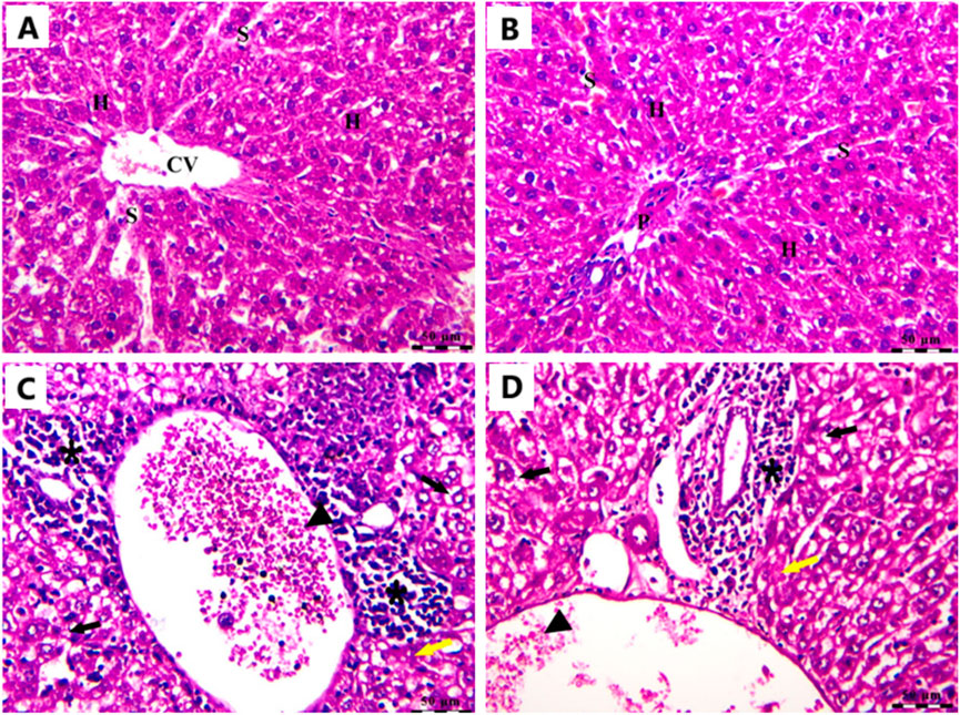Figure 10. Photomicrograph of the liver stained by H&E in the Cnt group (A,B) and the EAC group (C,D). All labels are indicated in the main text. Scale bars = 50 µm.