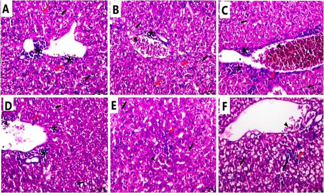 In the Cnt group, the liver has a healthy structure with polyhedral-shaped hepatocytes arranged in a cord-like pattern (H) radiating from the intact central vein (CV) and separated by blood sinusoids (S) and an intact portal artery (P) (Figures 10A,B). In the EAC group, notable pathological alterations are evident, including aggregations of polymorphic neoplastic cells (asterisks) around the congested central vein (arrowheads), swelling and vacuolar degeneration of hepatocytes (black arrows), and an area of hepatocellular necrosis (yellow arrows) (Figures 10C,D). Cis Ls treatment decreased neoplastic cell clusters (asterisks) around the congested hepatic blood vessels (arrowheads). However, isolated polymorphic neoplastic cells remained (red arrows), and some hepatocytes exhibited swelling and vacuolar degeneration (black arrows) (Figures 11A,B). Ant Ls therapy has a therapeutic benefit by diminishing neoplastic cell clusters (asterisks) around the mildly congested hepatic blood vessels (arrowheads). Still, some hepatocyte degradation persists (black arrows) in addition to the number of sporadic polymorphic neoplastic cells (red arrow) (Figures 11C,D). Cis + Ant Ls has the most pronounced ameliorative benefits, shown by diminished clusters of degenerative neoplastic cells (red arrows), decreased congestion of hepatic blood vessels (arrowheads), and reduced hepatocellular degeneration symptoms (black arrows) (Figures 11E,F). The findings indicate that Cis and Ant, alone and in conjunction, may provide therapeutic advantages in alleviating liver damage caused by migratory EAC cells, with their combination yielding superior protective effects.