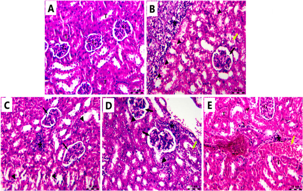 In the Cnt group, the kidney had a robust architecture, featuring intact glomeruli (G) encased by Bowman’s capsules and well-structured proximal and distal convoluted tubules (T) (Figure 12A). In the (EAC) group, pathological alterations are observed, including clusters of polymorphic neoplastic cells (asterisk), degeneration of tubular epithelium (arrowheads), hyaline casts (yellow arrow), atrophied glomeruli, and enlarged capsular space (black arrow) (Figure 12B). Individual treatment with Cis Ls or Ant Ls demonstrated modest enhancement, characterized by reduced clusters of degenerated neoplastic cells (asterisk) around congested renal blood vessels (yellow arrow), accompanied by minimal glomerular shrinkage (black arrow). However, degeneration of the tubular epithelium continues (arrowheads) (Figures 12C,D). The Cis + Ant Ls group had the most pronounced ameliorative impact, characterized by minimal clusters of degenerated neoplastic cells (asterisk), diminished vascular congestion (yellow arrow), intact tubular epithelium (T), and retained glomeruli (G) (Figure 12E). Our data demonstrate that Cis and Ant, either alone or in combination, may help mitigate EAC-induced kidney injury, with the combined treatment offering the most robust protection.