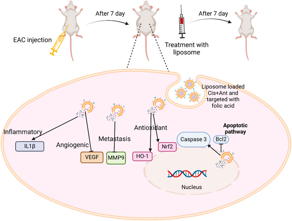 Ant, Anthocyanin; Bcl2, B cell lymphoma 2; Cis, Cisplatin; EAC, Ehrlich ascites carcinoma; FA, Folic acid; FTIR, Fourier Transform Infrared Spectrometer; H&E, Hematoxylin and eosin; Ls, Liposomes; MMP9, Matrix metalloproteinase 9; NPs, Nanoparticles; Nrf2, Nuclear factor erythroid 2-related factor 2; HO-1, Heme oxygenase-1; VEGF, Vascular endothelial growth factor.