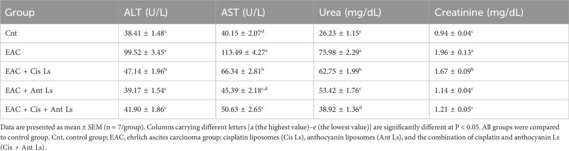 Mice carrying EAC showed notable liver and kidney damage, indicated by significantly (P < 0.05) higher levels of serum ALT, AST, urea, and creatinine compared to healthy mice. EAC cells can migrate from the peritoneal cavity to liver and kidney causing tissue damage (Tawfic et al., 2024b). All treatment approaches effectively reduced hepatic and renal impairment. Ant Ls alone and the combined therapy (Cis + Ant Ls) exhibited the strongest liver and kidney-protective effects, bringing ALT, AST, urea, and creatinine levels close to normal. In contrast, treatment with Cis Ls alone resulted in only a moderate recovery. Since Cis is known to cause liver and kidney damage, the observed reduction in serum ALT, AST, urea, and creatinine levels may be due to fewer EAC cells migrating to these organs following Cis Ls treatment, as supported by histopathological findings.