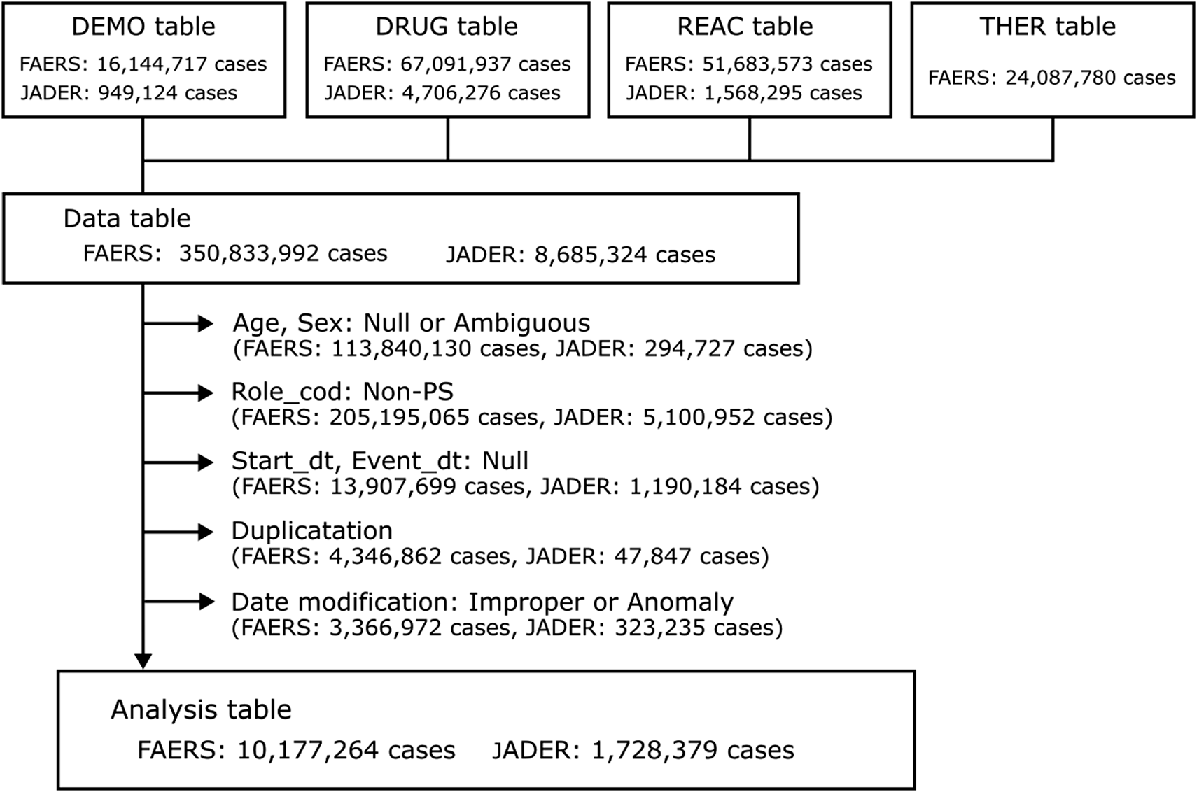 Data from the JADER database between April 2004 and October 2024 were obtained from the PMDA website (www.pmda.go.jp; available only in Japanese). The structure of the JADER database adheres to international safety reporting guidelines (ICH E2B). The JADER dataset included four tables: patient demographic information (DEMO), drug information (DRUG), AEs (REAC), and primary diseases (HIST). The JADER data were disorganized and required extensive cleaning before it could be integrated into the database. To address this, we utilized the Text Editor and OpenRefine for several tasks, including merging records with obvious input errors, processing fields containing multiple entries, removing the time portion from date/year entries that included time, converting data marked as “unknown” to NULL values, and correcting inconsistencies between full-width and half-width characters. The DEMO table was linked to the DRUG and REAC tables using ID numbers. Blank and unknown data regarding sex, age, start date of administration, event date of AE occurrence, and duplicate entries were excluded. Drugs with a role code of “suspected drug” were included. The date processing used in FAERS has been applied to the JADER database.