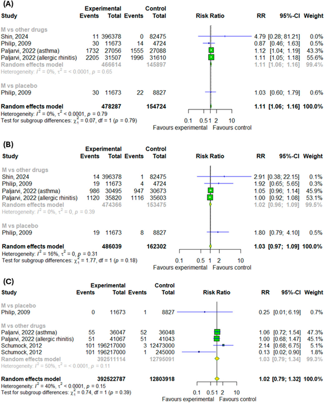 Only 4 studies were included in the subgroup analysis. Overall, montelukast treatment was associated with a higher risk of anxiety by 11% (RR = 1.11; 95% CI [1.06; 1.16]; p < 0.0001, I2 = 0%) without differences between subgroups (Figure 2A). However, montelukast treatment didn’t increased the risk of depression as well as suicidal and self-injurious behaviors, nonfatal self-harm or completed suicides (p > 0.05), as showed in Figures 2B,C.