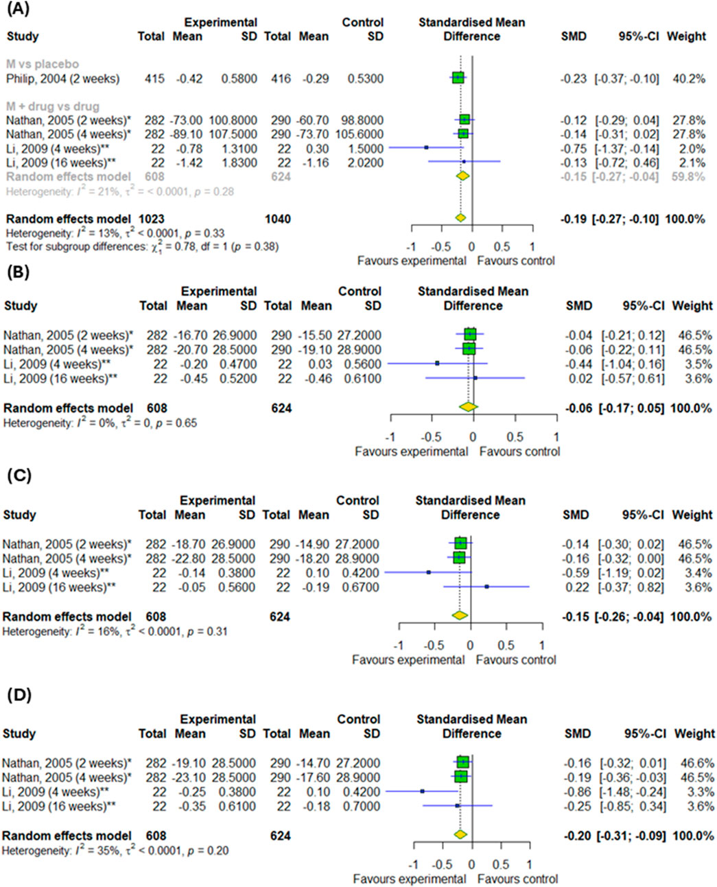 Figure 3. The efficacy of montelukast treatment on the changes in daytime symptoms, such as (A) total nasal symptoms or daytime composite symptoms, (B) nasal congestion, (C) nasal pruritus and (D) sneezing in patients with asthma and AR. M–montelukast; *inhaled corticosteroids; **second-generation antihistamines.