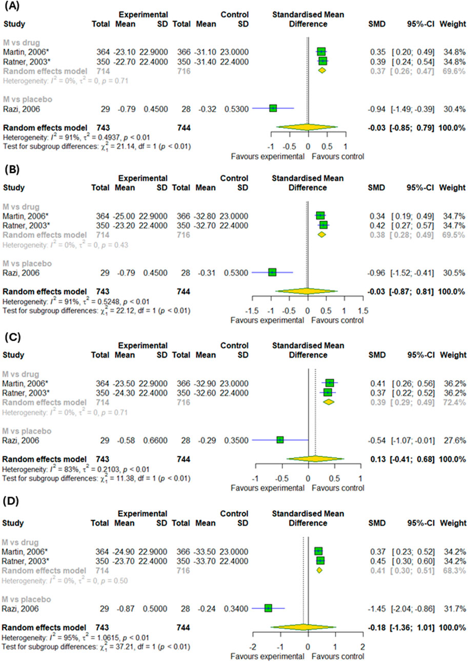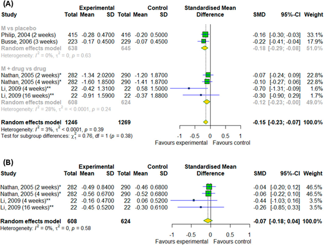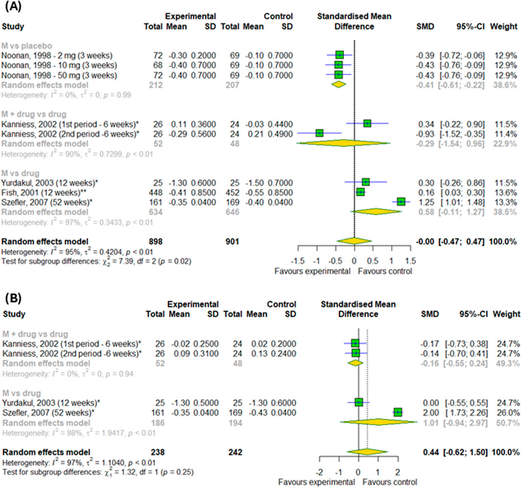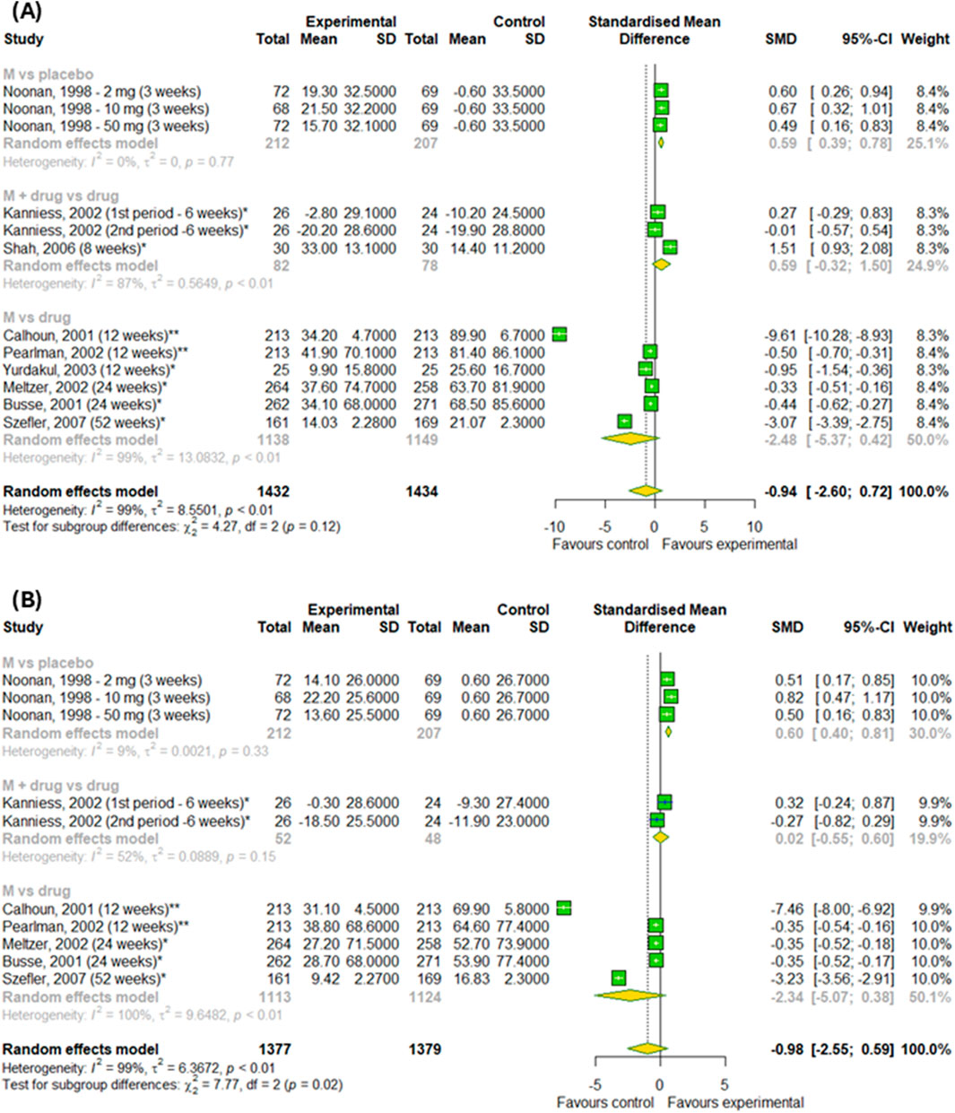 In the final stage, we checked the efficacy of montelukast on daytime and nighttime symptoms in patients with asthma (Figures 9A,B). Overall, there was no differences between experimental and control groups (p > 0.05). However, subgroup analysis found the differences between subgroups in changes in daytime symptoms (p = 0.02) – montelukast was better than placebo (SMD = −0.41; 95% CI [-0.61; 0.22]), but worse than active drugs (SMD = 0.58; 95% CI [-0.11; 1.27]).