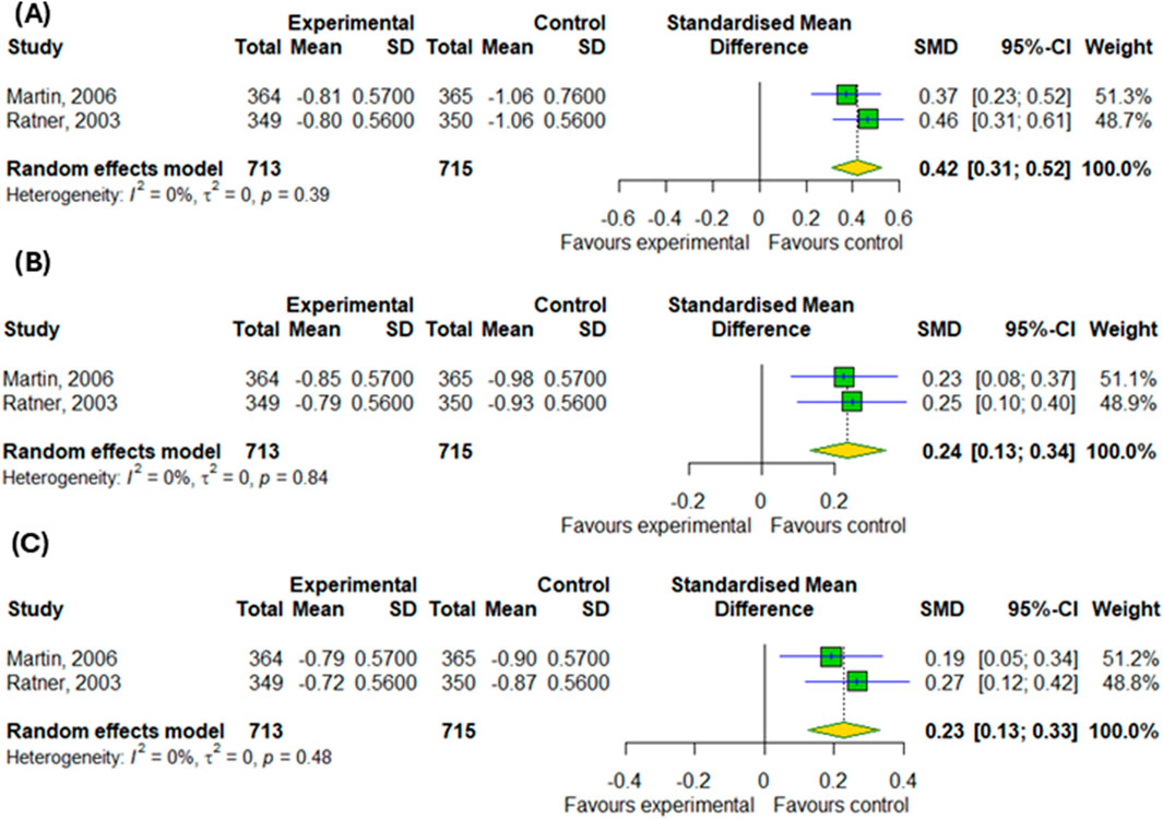 In addition, we also detected differences in the changes in nighttime symptoms, such as nasal congestion on awakening (SMD = 0.42; 95% CI [0.31; 0.52]); p < 0.0001; I2 = 0%), difficulty getting to sleep due to nasal symptoms (SMD = 0.24; 95% CI [0.13; 0.34]); p < 0.0001; I2 = 0%) and nighttime awakenings due to nasal symptom (SMD = 0.23; 95% CI [0.13; 0.33]); p < 0.0001; I2 = 0%) in compare to inhaled corticosteroids, as showed in Figures 6A–C.