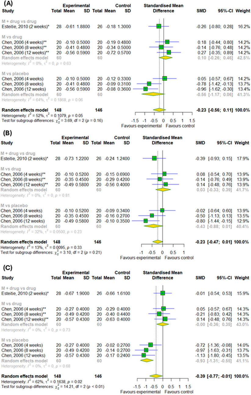 On the last step, we examined the efficacy of montelukast treatment for daily symptoms. There were no differences in rhinorrhea and sneezing symptom changes compared to control groups and there were no differences between subgroups (p > 0.05) (Figures 7A,B). However, we detected differences in the changes in nasal congestion (SMD = −0.39; 95% CI [-0.77; −0.01]); p = 0.046; I2 = 62%) between experimental and control groups with differences between subgroups, such as montelukast vs. placebo, montelukast + drug vs. drugs and montelukast vs. drug (p = 0.0008) (Figure 7C).