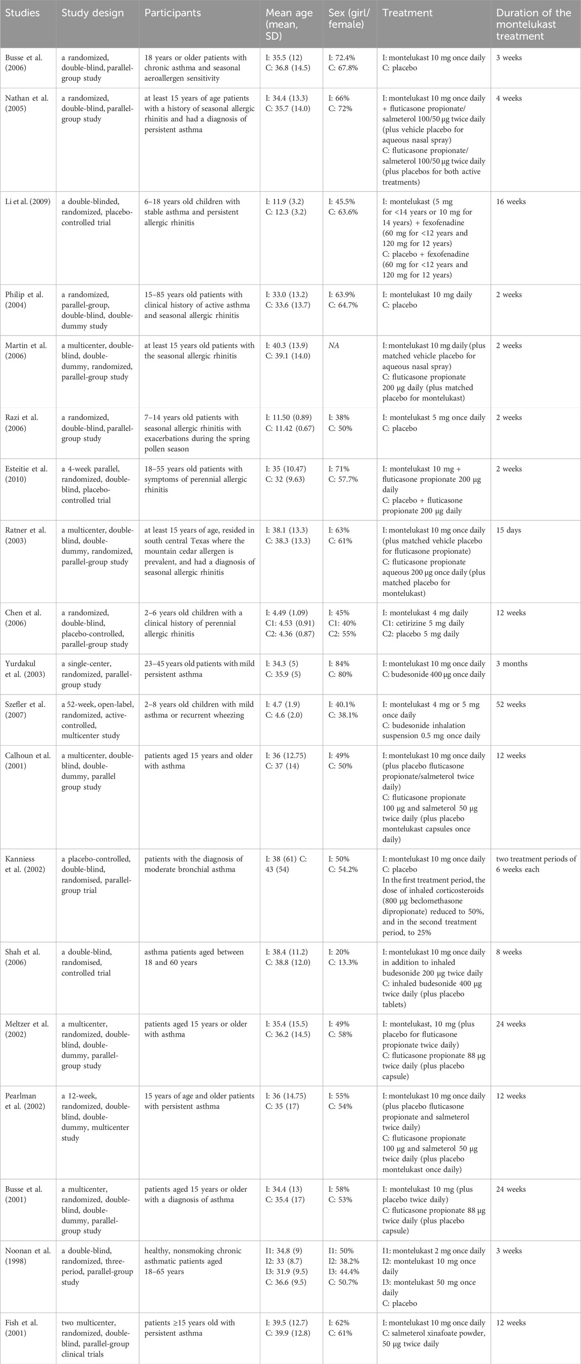 For efficacy analysis, literature search yielded 2291 articles after removal of duplicates (Supplementary Figure S2). In the first screening, we excluded 1960 articles, such as meta-analysis, systematic reviews, literature reviews, editorial letters, as well as in vitro studies, studies on animals, case reports and observational studies. After full-text screening, 19 articles were qualified for meta-analysis. All included studies are randomized controlled trials investigated the efficacy of montelukast to treatment asthma or/and allergic rhinitis. These studies were carried out in the United States of America (United States) (Busse et al., 2006; Nathan et al., 2005; Martin et al., 2006; Esteitie et al., 2010; Ratner et al., 2003; Szefler et al., 2007; Calhoun et al., 2001; Meltzer et al., 2002; Pearlman et al., 2002; Busse et al., 2001; Noonan et al., 1998), China (Li et al., 2009), the United States of America and Europe (Philip et al., 2004), the United States of America and Puerto Rico (Fish et al., 2001), Turkey (Razi et al., 2006; Yurdakul et al., 2003), Taiwan (Chen et al., 2006) and Germany (Kanniess et al., 2002), India (Shah et al., 2006). Some studies included only pediatric patients (Szefler et al., 2007; Li et al., 2009; Razi et al., 2006; Chen et al., 2006). Table 1 presents the characteristics of the studies included.