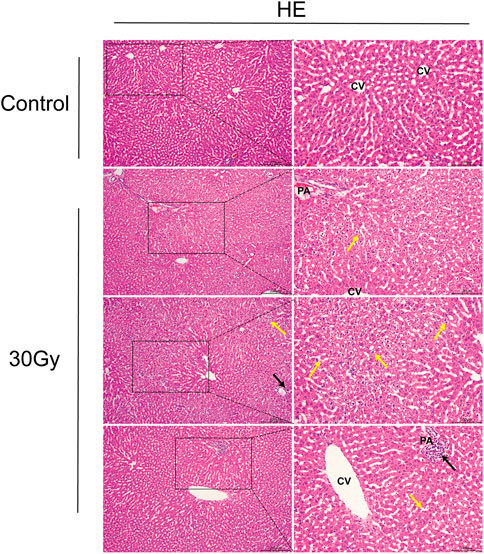 Figure 1. HE stains of liver tissue control group vs. 30Gy group. Cell swelling (Yellow arrows) and inflammatory infiltration (Black arrows) in hepatocytes. PA: Portal areas; CV: Central vein.