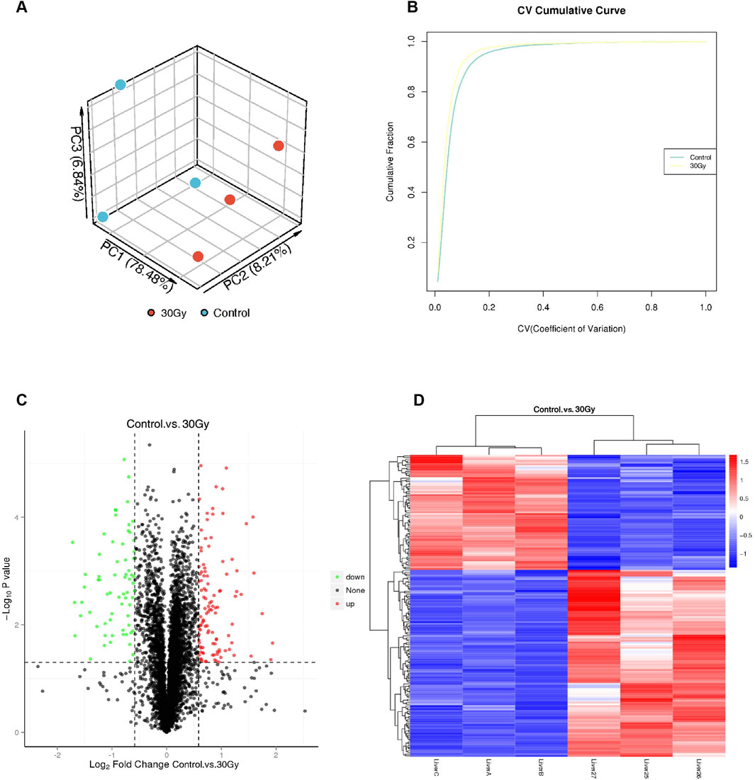 PCA showed significant separation in the gene expression profiles of the 30Gy group and the control group in three-dimensional space, especially in the PC1 direction. Therefore, there might be obvious differences between the two groups in gene expression or proteomic features. The relative intra-group clustering of the three samples indicated relative spatial consistency in terms of the main characteristics of samples within group, suggesting low variability and good reproducibility in intra-group samples (Figure 2A). The CV cumulative curve can facilitate the assessment of the difference in inter-group variability, where the X-axis with lower CV indicates a higher concentration of the sample value, and higher CVs indicate greater inter-sample variation. Meanwhile, the Y-axis indicates the cumulative fraction, i.e., the proportion of samples with different CV values and below. As the CV increases, the cumulative fraction elevates and eventually approaches 1, indicating 100% of the sample data. As shown in Figure 2B, the steeper CV cumulative curve for the RILI and the control groups revealed less variability in the sample at 100%, i.e., better repeatability of the overall samples.