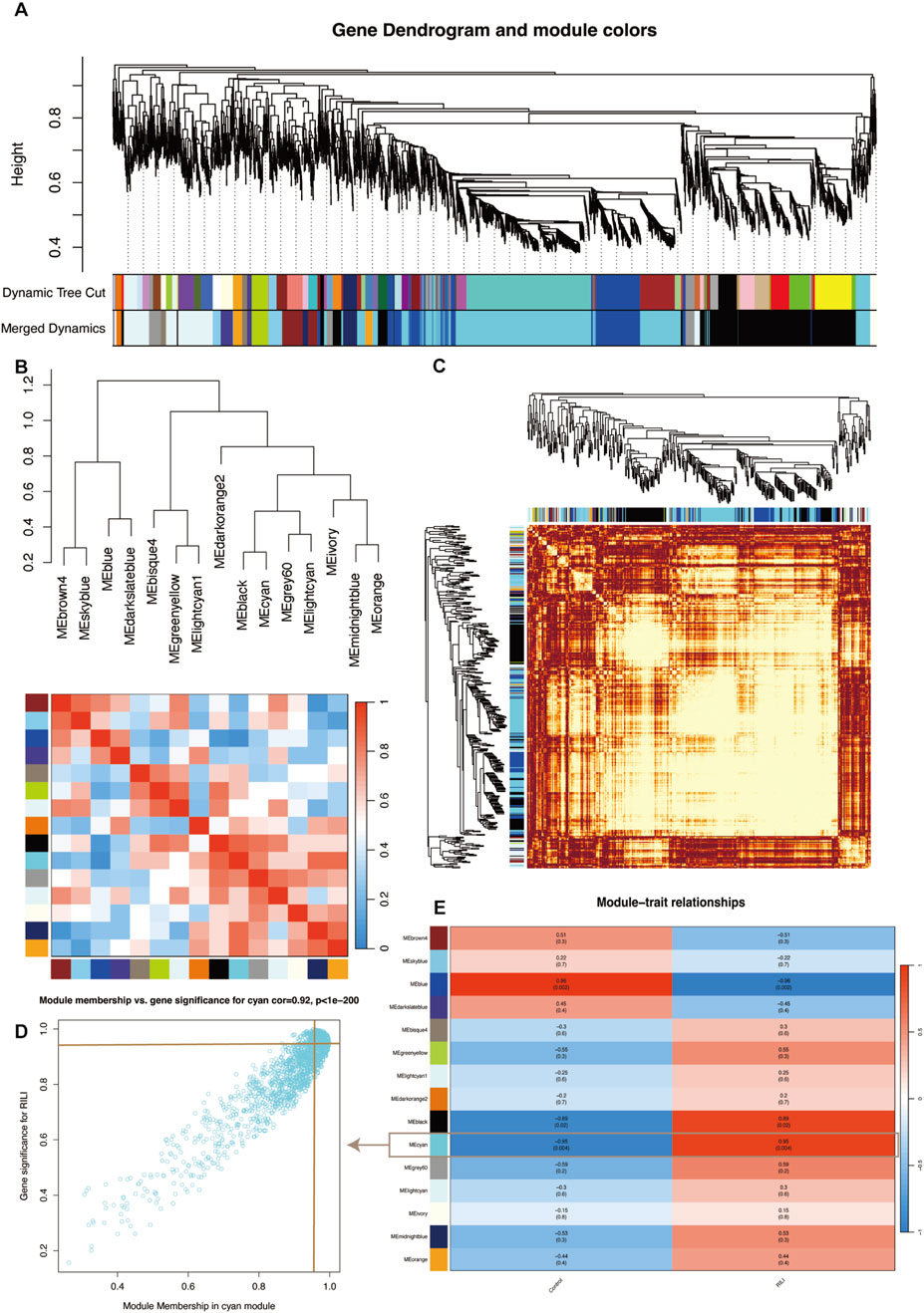 Figure 3. WGCNA identifying RILI-associated gene modules and their correlation with phenotypic traits. (A) Gene clustering dendrogram with module partitioning; (B) Similarity clustering between module eigenvalues with heatmaps; (C) Topological overlap matrix (TOM) heatmap; (D) Plot of gene significance within a module in relation to module membership. The point labeled by the crossing line is THBS1; (E) Plot of gene significance within a module in relation to module membership.