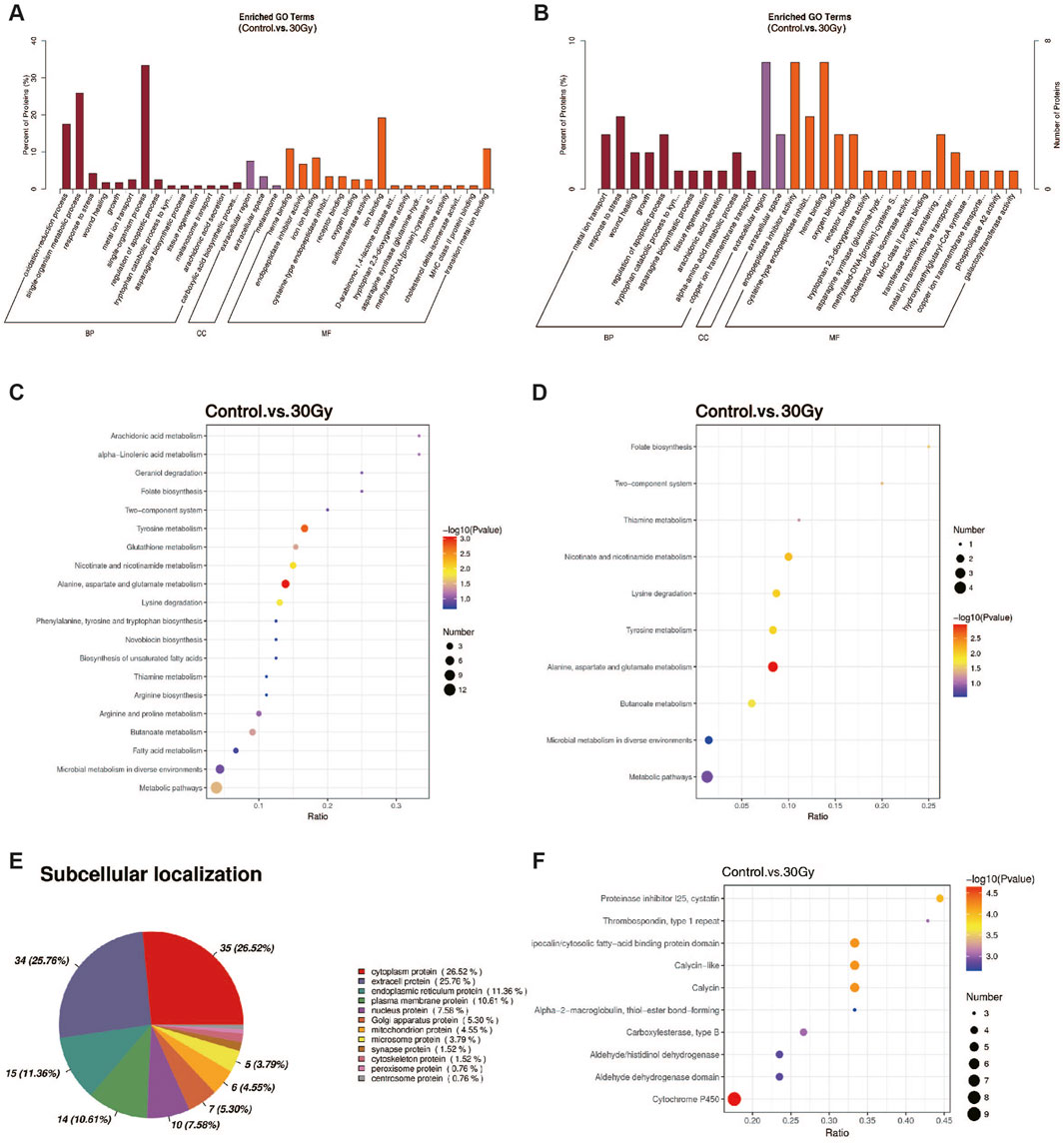 Figure 4. Functional enrichment and subcellular localization analyses of DEPs in RILI. (A) GO enrichment analysis of DEPs; (B) GO enrichment analysis of upregulated DEPs; (C) KEGG enrichment analysis of DEPs; (D) KEGG enrichment analysis of upregulated DEPs; (E) Analysis of the subcellular localization of DEPs: More than 1/4 of the DEPs are distributed in the cytoplasm or extracellular matrix; (F) Structural domain enrichment analysis of DEPs: The biological roles of DEPs, as highly conserved functional units, can be revealed by structural domain enrichment analysis at both structural and functional levels. Enriched functional modules or protein family features can be effectively identified, in turn indicating the activation or inhibition of potential signaling pathways.