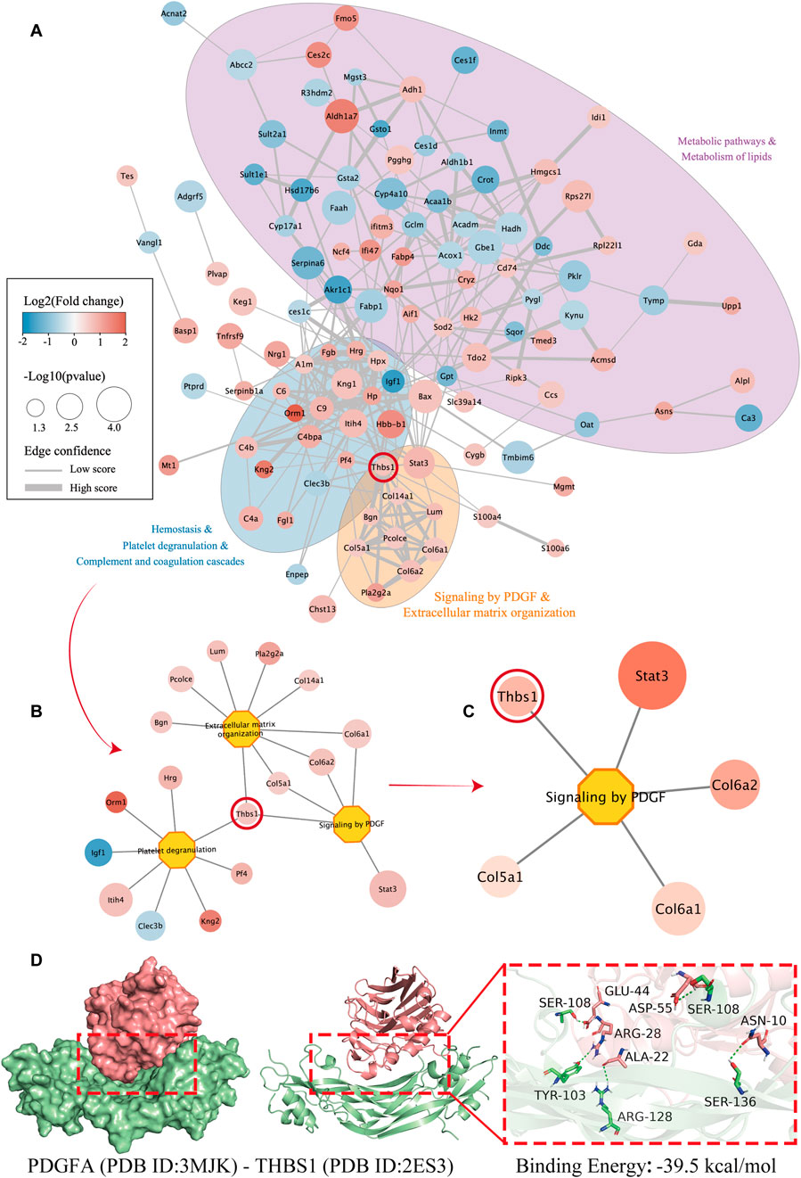 Figure 5. PPI network and molecular docking reveal THBS1 as a central regulator linking PDGF signaling and extracellular matrix remodeling in RILI. (A) PPI analysis and result visualization via CytoScape. DEPs are visualized using a PPI-based analysis, where node size indicates statistical significance (-log10 p value), color displays changes in expression (red: upregulation, and blue: downregulation), and edge thickness reflects the level of confidence in the interaction. Multiple functional clusters can be identified in the network, including lipid metabolism and metabolic pathways (purple region), hemostasis and platelet degranulation (blue region), as well as PDGF signaling and extracellular matrix organization (orange region). THBS1 is positioned as a core node connecting multiple important functional clusters, suggesting its key role in multi-pathway regulation; (B) Further extraction of proteins directly interacting with THBS1 and their related biological processes to form a functional sub-network centered on “extracellular matrix remodeling” and “PDGF signaling pathway”. THBS1 is enriched in the extracellular matrix regulatory pathway together with Col6a1 and Col6a2, suggesting its important function in tissue remodeling and inflammatory repair; (C) Identification of the closely related signaling molecules and their downstream targets by focusing on the key pathway “Signaling by PDGF”, such as Stat3 and Col6a2, to further validate the possible mechanism of THBS1 mediating tissue fibrosis and inflammation through regulating PDGF signaling; (D) The protein-protein docking results of PDGFA (green, PDB ID: 3MJK) with THBS1 (pink, PDB ID: 2ES3). There are several interactions between key residues in the binding interface, including ARG-28, ARG-128, SER-108, TYR-103, etc. The binding energy is as high as −39.5 kcal/mol, suggesting that the two factors may form a stable complex, providing potential theoretical support for further verification of their molecular interactions.