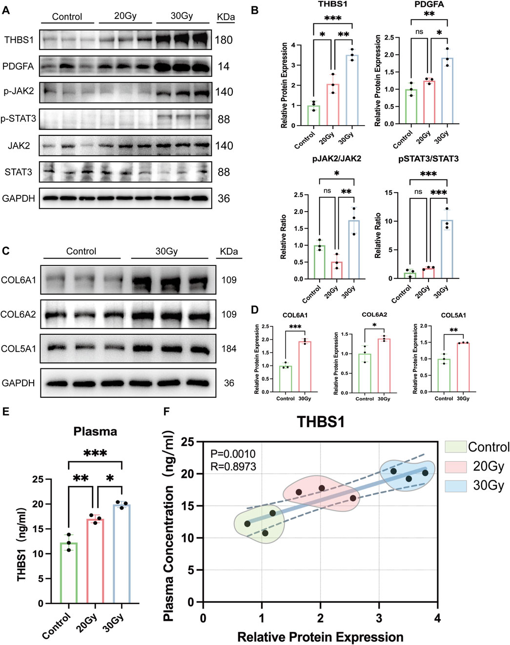 Figure 6. Validation of THBS1 upregulation and activation of the PDGF–JAK2/STAT3 signaling pathway in RILI and its association with collagen expression. (A,B) Western blot analysis of THBS1, PDGFA, JAK2/pJAK2, and STAT3/pSTAT3 protein expression in normal, 20Gy and 30Gy groups of rats; (C,D) Western blot analysis of COL6A1, COL6A2, and COL5A1 protein expression in normal and 30Gy groups of rats; (E) result of ELISA; (F) Pearson correlation analysis (*P < 0.05, **P < 0.01 and ***P < 0.001).