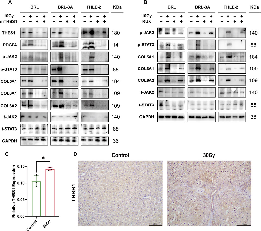 Figure 7. The Effects of siTHBS1 and JAK/STAT Inhibition on JAK2/STAT3 Pathway Activation and Collagen Expression in Radiation-Induced Hepatocytes (A) Western blot analysis of THBS1 knockdown in rat (BRL and BRL-3A) and human (THLE-2) hepatocytes shows reduced JAK/STAT activation and reversal of collagen upregulation (B) Western blot analysis of JAK/STAT pathway inhibition with Ruxolitinib in hepatocytes, demonstrating reduced JAK2/STAT3 activation and reversal of collagen upregulation; (C) Quantitative analysis of THBS1 immunostaining reveals significantly higher expression in the 30 Gy group compared to the controls (P < 0.05); (D) Representative IHC images demonstrate increased THBS1 deposition in irradiated (30 Gy) liver tissue compared with controls.