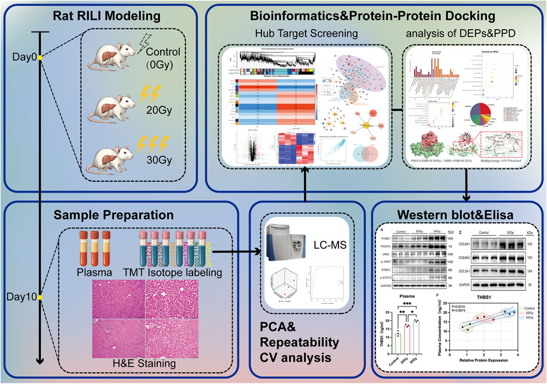 Methods: This study established a rat model of RILI, with the assessment of liver injury by hematoxylin-eosin (HE) staining. High-throughput screening of RILI and normal liver tissue samples was performed using TMT quantitative proteomics technology, followed by the analysis of differentially expressed proteins (DEPs) using GO and KEGG. Weighted gene co-expression network analysis (WGCNA) and protein-protein interaction (PPI) network analysis were further employed to identify THBS1 as a key protein of RILI. We knocked down THBS1 in rat (BRL, BRL-3A) and human (THLE-2) hepatocytes using siRNA and applied Ruxolitinib to inhibit the JAK2/STAT3 pathway, further clarifying the role of THBS1 in this signaling process. Validation was performed by protein-protein docking and Western blot. The concentration of THBS1 in plasma was determined using enzyme linked immunosorbent assay (ELISA), while the consistency of plasma and tissue expression was analyzed by Pearson’s correlation analysis.