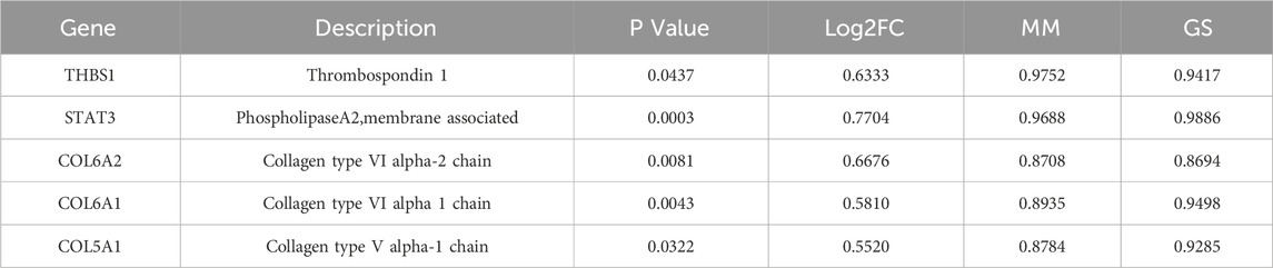 Weighted Gene Co-expression Network Analysis (WGCNA) was performed to identify gene modules closely associated with the radiation-induced liver injury (RILI) phenotype. As shown in Figures 3A–C, genes were clustered based on their expression profiles, with those exhibiting similar patterns grouped into the same module. Hierarchical clustering identified 15 distinct gene modules, among which the Cyan module showed the strongest correlation with RILI (R = 0.95, Figures 3D,E). Liver tissues from the modeled and control rats were taken for proteomics, resulting in 176 DEPs, of which 106 were upregulated and 70 were downregulated. These DEPs were visualized using volcano and heat maps (Figures 2C,D). By Venn diagram analysis, THBS1 gene was enriched in both WGCNA key modules and DEGs list, with both MM and GS of >0.85, suggesting its potentially significant role in the development of RILI with high biological significance (Supplementary Figures S2D). The key DEPs intersected with the WGCNA (Cyan) are shown in Table 1, mainly including THBS1, STAT3, COL6A2, etc.