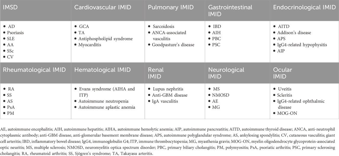 Immune-mediated inflammatory diseases (IMIDs) encompass a broad group of chronic disorders characterized by dysregulated immune responses and persistent inflammation. IMIDs can affect multiple organ systems, including the skin, joints, gastrointestinal tract, and central nervous system. IMSDs include clinically important conditions such as AD, psoriasis, SLE, alopecia areata, SSc, and vasculitis. The relationships between IMIDs and IMSDs, along with examples of common diseases in each category, are shown in Table 2.