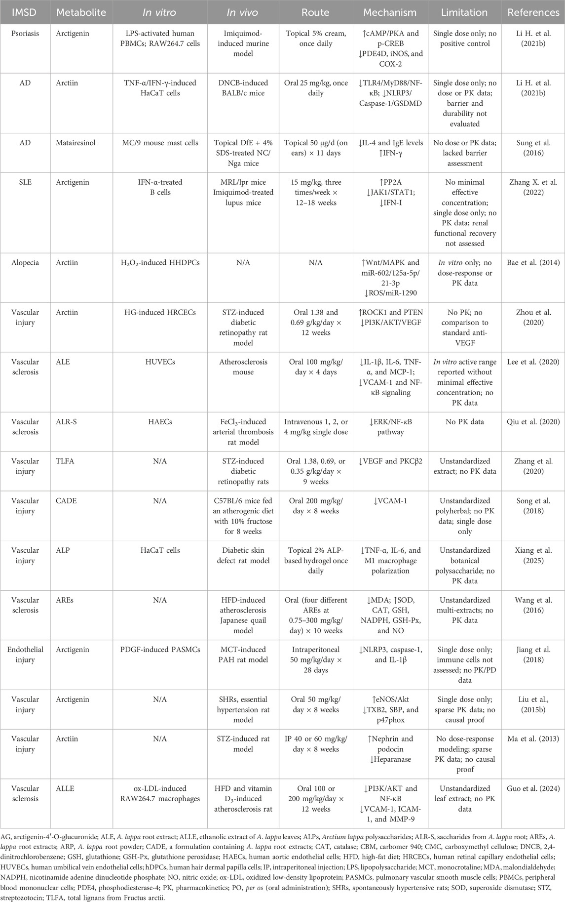 Given the increasing incidence and substantial effects of IMSDs on patient quality of life, novel, safer, and more effective therapeutic strategies are urgently needed (Hyam et al., 2013; Wang et al., 2023). Natural metabolites such as arctiin and arctigenin, which exhibit anti-inflammatory, antioxidant, and immunomodulatory activities, have emerged as promising candidates (Chen X. F. et al., 2024). Preclinical studies have demonstrated the ability of arctiin and arctigenin to regulate cytokine production, inhibit inflammatory signaling pathways, promote tissue repair, and restore immune homeostasis, suggesting their therapeutic potential for IMSDs (Jin et al., 2024). An overview of studies on A. lappa extracts for the treatment of IMSDs is presented in Figure 2, while Table 3 provides a schematic illustration of the proposed mechanisms of action of these metabolites.