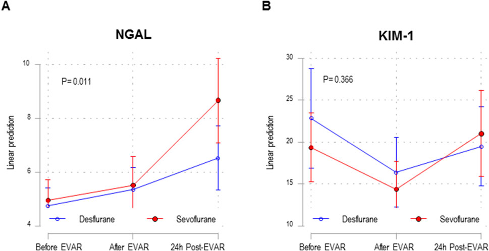 Figure 1. Mixed linear model in NGAL (A) and KIM-1 (B) study in the desflurane (n = 40) and sevoflurane (n = 40) groups, at the three study time points. EVAR, endovascular aneurysm repair. Estimated NGAL means and their 95% confidence intervals obtained using the linear mixed model. The p-value in the figure corresponds to the interaction between the anesthetic group and measurement time points.