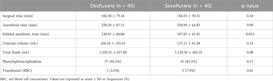 Intraoperative variables in the desflurane and sevoflurane groups are summarized in Table 2. Both groups were similar in terms of the duration of anesthesia (defined as the time from patient monitoring to their extubation in the operating room), surgical time (defined as the time from skin incision to the closure of the surgical wounds), and duration of volatile anesthetic administration (desflurane or sevoflurane). Intraoperatively, all patients received the same type of the intravenous contrast agent (iopamidol), and there were no significant differences between groups in the volume of the drug administrated. Intraoperative data included administered fluids, the use of vasoactive drugs (phenylephrine and ephedrine), and quantification of transfusion requirements (red blood cell concentrates), not finding significant differences between both groups, i.e., desflurane and sevoflurane.