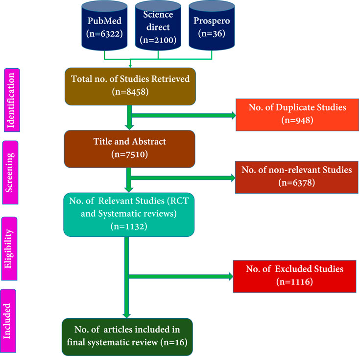 We retrieved 8,458 titles and abstracts, from which 948 duplicates were identified and removed using Rayyan online software. Among the remaining 7,510 articles, 1,132 were relevant to RCTs conducted on menopausal women, while 6,378 were deemed irrelevant. The 1,132 potentially relevant articles were screened, and 72 full-text RCTs were evaluated for eligibility. After further review, 16 full-length RCTs that met the inclusion criteria were selected for the systematic review and data extraction phase (Figure 1).