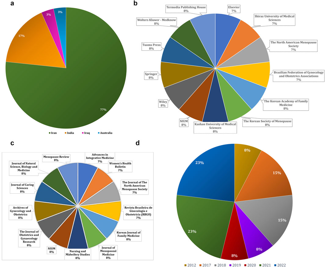 The present data as per country, publishers, and Journals sources shared in the publications related to the menopausal symptoms in women. Geographically, most studies were conducted in Iran, which accounted for approximately 77% of the publications, followed by India (17%), Iraq (3%), and Australia (3%) (Figure 2a). Regarding journal sources and publishers, the majority of publications were clustered among a few leading publishers, as shown in Figures 2b,c. Year-wise distribution revealed that research output increased notably in 2021 and 2022, which together represented 46% of total studies, followed by 2018 (18%) (Figure 2d). In addition to peer-reviewed articles, two dissertations were also included in the analysis to provide broader coverage of the literature.