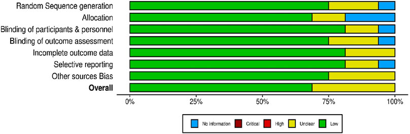 The methodological quality and risk of bias of the 16 included randomized controlled trials (RCTs) were evaluated using a modified version of the Cochrane Risk of Bias (RoB 1.0) tool, adapted for assessing randomized studies. To visualize the results, the Robvis web application https://mcguinlu.shinyapps.io/robvis/was utilized on 26 December 2024, generating both a traffic light plot (Figure 3) that illustrates individual study-level assessments and a summary plot (Figure 4) that aggregates domain-level judgments across all studies. Most studies were found to have a low to moderate risk of bias, suggesting an overall acceptable level of methodological quality and reliability in the included evidence. Specifically, several trials including those by Azami et al., Bazrafsham et al., Gopal et al., Shirazi et al., and Naser et al. exhibited low risk in key domains such as random sequence generation, allocation concealment, handling of incomplete outcome data, and selective reporting. Nevertheless, certain studies showed areas of concern. For example, insufficient reporting of blinding procedures for participants, personnel, and outcome assessors led to an unclear risk of performance and detection bias in studies by Taavoni et al. (2017), Taha and Dizaye (2022), and Mahdavian et al. (2019). Furthermore, inadequate details on randomization methods and allocation concealment were observed in studies such as Banu and Begum, (2012), Dadfar and Bamdad (2019), and Rais et al. (2020), further contributing to an unclear risk assessment. Overall, while the majority of the RCTs demonstrated sound methodological practices, limitations in the reporting of blinding and randomization processes in a few studies should be taken into account when interpreting the overall findings of this scoping review.