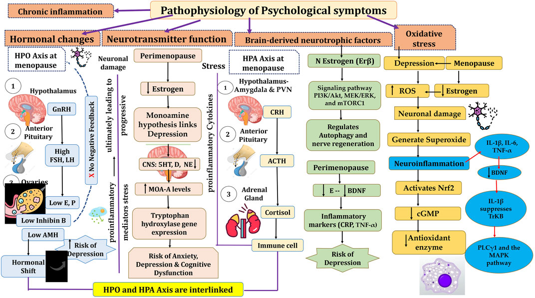 In this section we provide a comprehensive analysis of the mechanisms underlying perimenopausal psychological symptoms including depression, anxiety and stress, emphasizing the intricate connections between hormonal changes, neurotransmitter function, BNDF, chronic inflammation, and oxidative stress.