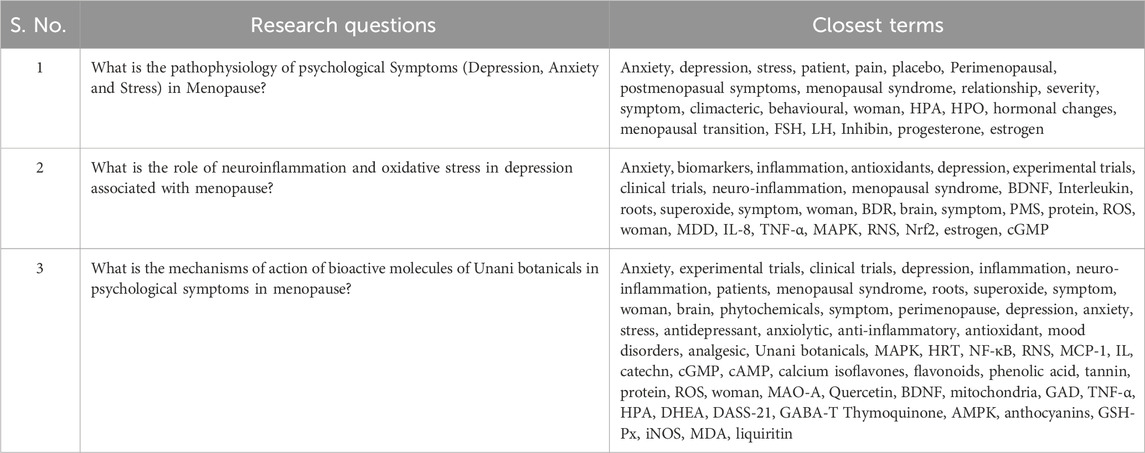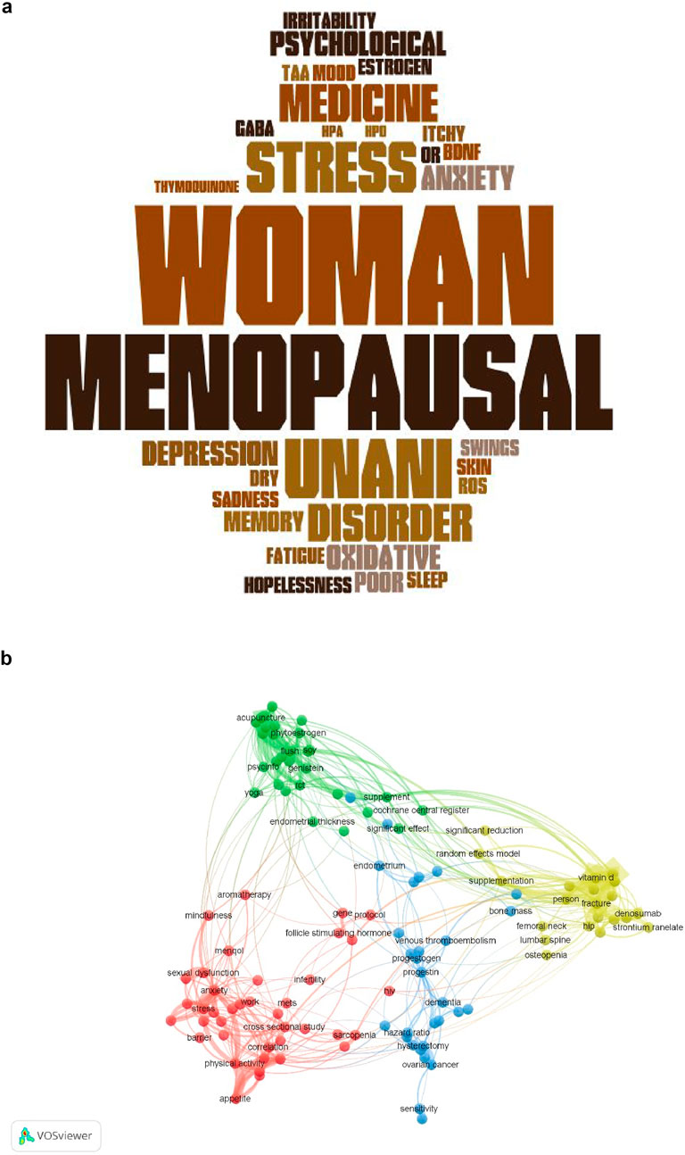 To the best of our review, this is the first systematic review to assess the effectiveness of Unani botanicals in depression, anxiety and stress symptoms in menopausal women. Table 1 highlights RCTs examining Unani botanicals for managing psychological menopausal symptoms. The study formulated research questions addressing the efficacy of Unani botanicals in depression, anxiety, and stress in menopausal women and emphasizing the role of Unani botanicals and their bioactive components. Computational tools were applied for network mapping, and word cloud creation, facilitating insights into these questions and guiding future research on menopausal symptom management. In 16 studies most of the research showed significant improvement in psychological symptoms in menopausal women. All studies were randomized, with four employing single-blind methods, four using triple-blind designs, seven implementing double-blind protocols, and one study not specifying its blinding approach. In all studies, the comparator was placebo. Most studies were two-arm, except for three. Shirazi et al. used a three-arm design, which included standard citalopram, M. officinalis, and a placebo group. Bazrafshan et al. also conducted a three-arm lavender, chamomile, and placebo study. Mahdavian et al. used a four-arm design, with different chamomile, fennel, and saffron doses, along with a placebo group. Of the 16 studies, nine reported side or adverse effects. Most studies provided insights into the mechanisms and pharmacological properties of the herbal medicines evaluated. In eight studies, the duration of intervention was 8 weeks. The tools used for diagnosing psychological menopausal symptoms included HAS, MRS, Greene’s Climacteric Scale, MKI, HDRS, BDS, SAS, and DASS. The MRS psychological subscale was used in seven studies, while DASS was used in only one study.