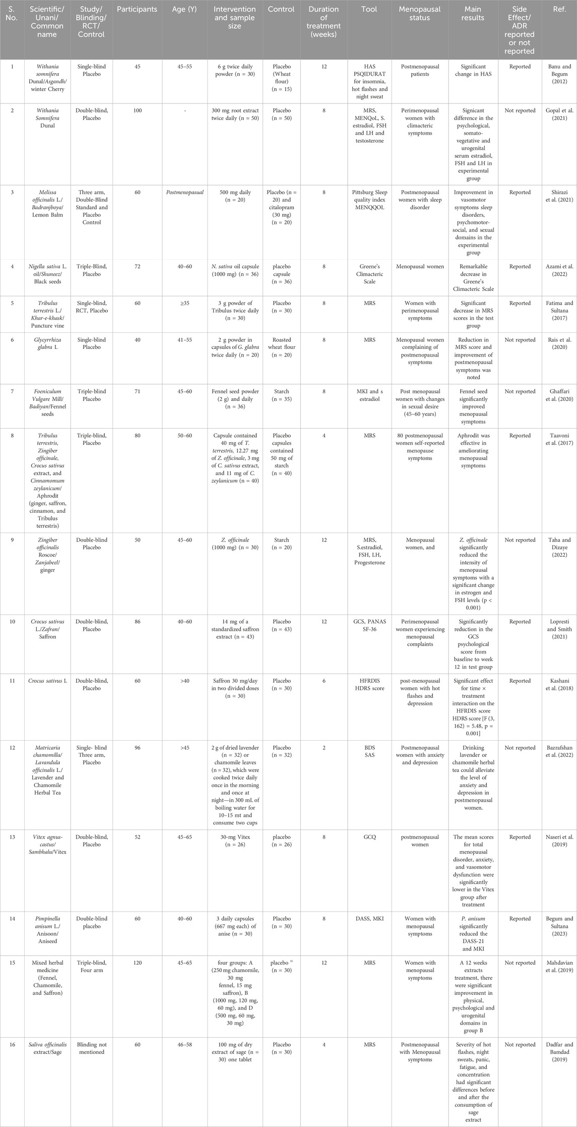 A total of 16 RCTs involving 1112 participants (mean ± SD: 69.5 ± 21.88; variance: 548.44) were identified. Among these, two studies involved a combination of herbal medicines, while the remaining 14 focused on single herbal medicines for managing menopausal symptoms. Additionally, two dissertation works were included. Other indexing sources were not considered, ensuring that the research questions addressed most relevant published articles. Table 1 Provides detailed characteristics of previously published studies including study design, participant numbers, tools (DASS-21, MRS), intervention types, and outcomes related to herbal medicines.