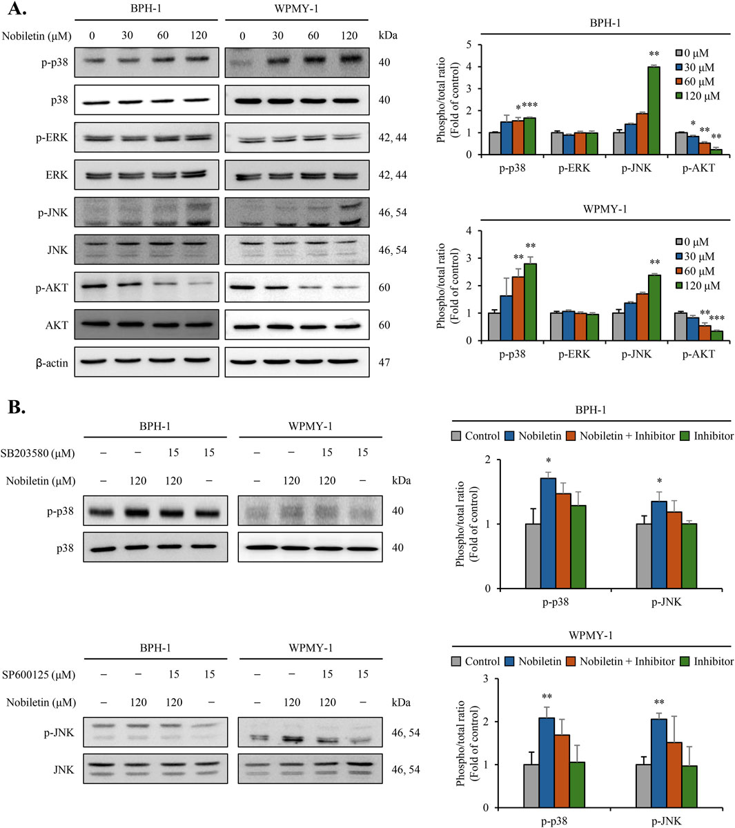 Figure 4. Nobiletin modulates MAPK and AKT phosphorylation in BPH cells. BPH-1 and WPMY-1 cells were treated with nobiletin (0, 30, 60, and 120 μM) for 24 h. (A) Total and phosphorylated MAPKs (p38, ERK, JNK) and AKT were analyzed by immunoblotting. (B) The phosphorylation levels of p38 and JNK were examined in cells treated with 120 μM nobiletin for 24 h in the presence or absence of their specific inhibitors SB203580 (15 μM, p38 inhibitor) and SP600125 (15 μM, JNK inhibitor). β-actin was used as the housekeeping protein. Quantification of phosphorylated protein levels relative to that of their total forms was performed using the ImageJ software. All data are presented as mean ± standard deviation (SD) from three independent experiments. *p < 0.05; **p < 0.01; ***p < 0.001.