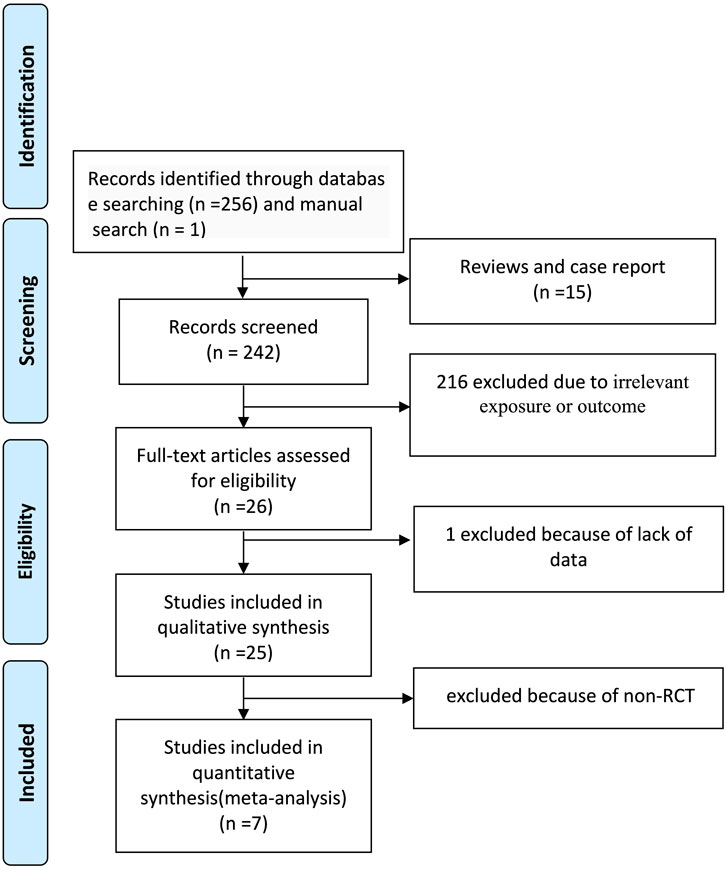 The systematic literature search yielded 257 records. After exclusion of 231 records (15 reviews/case reports and 216 irrelevant studies), 26 full-text articles underwent eligibility assessment. Nineteen studies were excluded: one due to insufficient data and 18 as non-randomized trials. Seven RCTs (Miura et al., 2008; Wang et al., 2020; Inoue et al., 2006; Sundel et al., 2003; Kobayashi et al., 2012; Ogata et al., 2012; Newburger et al., 2007) involving 801 patients were included in the final network meta-analysis (Figure 1).