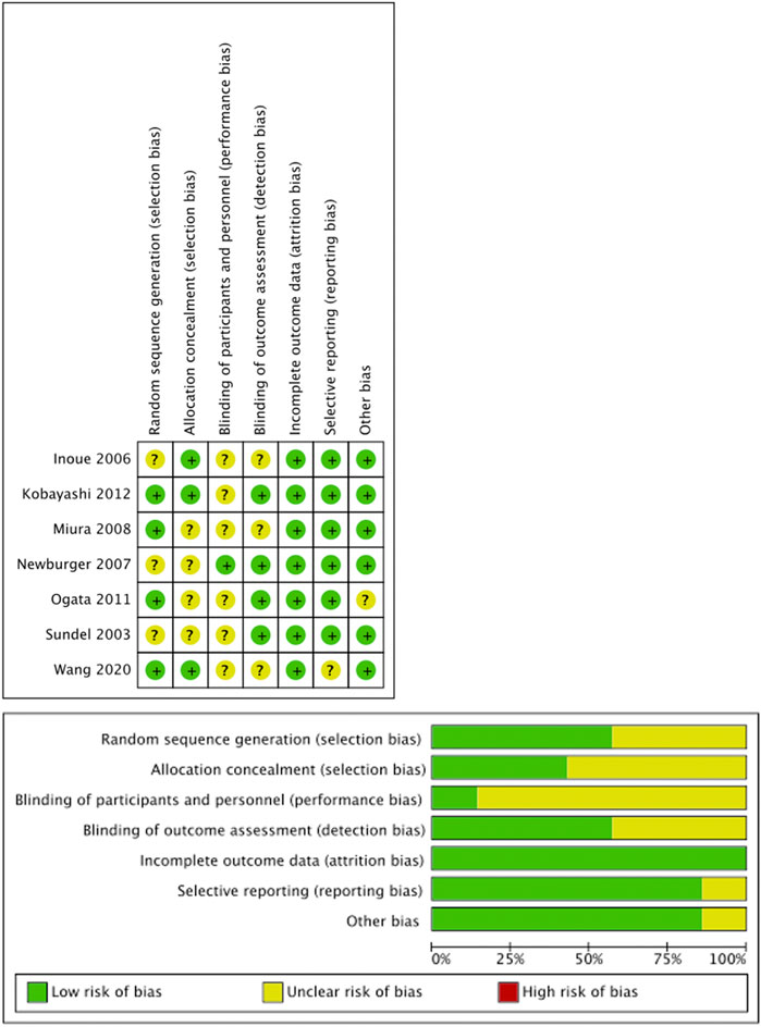 The Cochrane Risk of Bias Tool (Higgins JPT et al., 2019) was applied to assess the risk of bias in the included randomized controlled trials (RCTs), as assessed by MH and DPY.