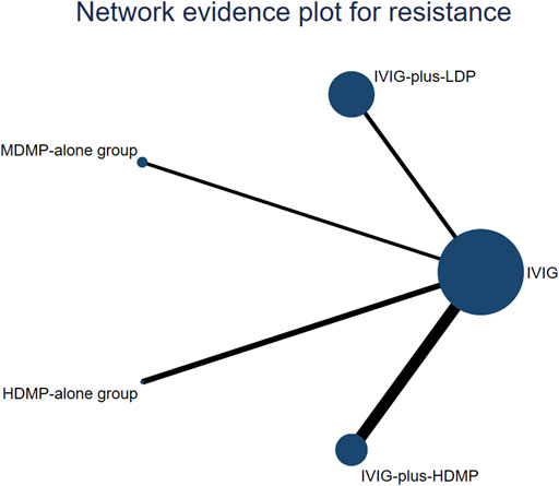 Corticosteroid regimens were categorized into three predefined doses based on reported protocols. Low-dose (LD): Prednisolone 2 mg/kg/day; medium-dose (MD): Methylprednisolone 15 mg/kg/day; high-dose (HD): Methylprednisolone 30 mg/kg/day (pulse therapy). The comparator group received IVIG without corticosteroids. Five treatment nodes formed the evidence network: IVIG-alone group (standard IVIG therapy without corticosteroids), MDMP-alone group (medium-dose methylprednisolone [MDMP] monotherapy), HDMP-alone group (high-dose methylprednisolone [HDMP] monotherapy), IVIG-plus-LDP group (IVIG combined with low-dose prednisolone[LDP]), IVIG-plus-HDMP group (IVIG combined with HDMP).
