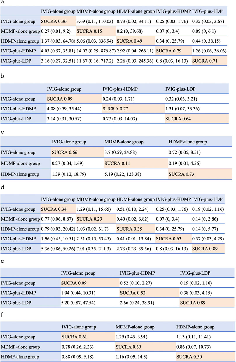 Figure 4. NMA results of effectiveness and coronary artery abnormality, followed by the ranking distribution according to SUCRA values. The highest SUCRA values indicate the highest probability of being the most effective treatment, and the lowest probability of the incidence of coronary artery dilation (CAD). Numbers in orange boxes were SUCRA values, where a value of 1 represents the most favorable outcome and 0 represents the least favorable outcome. The white square shows the ORs (Column vs. Row). (a) NMA results of treatment effectiveness, (b) NMA results of treatment effectiveness in initial stage treatment. (c) NMA results of treatment effectiveness in refractory stage treatment. (d) NMA results of the incidence of CAD. (e) NMA results of CAD in initial stage treatment. (f) NMA results of CAD in refractory stage treatment.