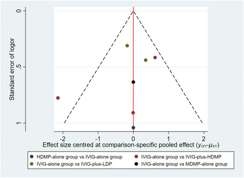 Figure 5. Network funnel plot for comparison of treatment effectiveness. Each circle represents a individual study contributing to the comparison; the outlier red circle denotes Ogata et al. (2012), the upper red circle indicates Newburger et al. (2007), the lower red circle represents Sundel et al. (2003), the upper green circle corresponds to Kobayashi et al. (2012) and the lower green circle to Inoue et al. (2006). The blue circle represents Miura et al. (2008), and the black circle denotes Wang et al. (2020).