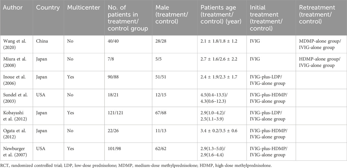 Geographically, studies originated from Japan (n = 4), the United States (n = 2), and China (n = 1). Five trials evaluated initial KD therapy (IVIG combined with corticosteroids), while two focused on IVIG-resistant KD (monotherapy comparisons). Detailed study characteristics are presented in Table 1.