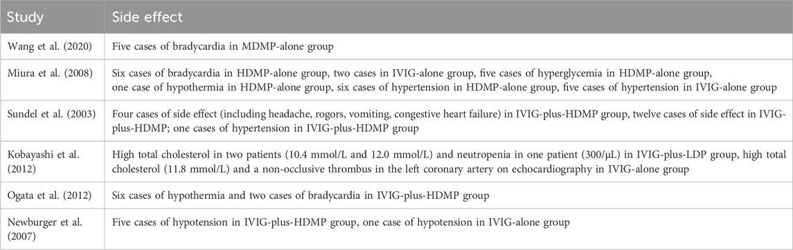 Adverse event data were available from 6 of the 7 included studies (Table 2). The most frequently reported events were hypertension (n = 12, six cases of hypertension in HDMP-alone group, five cases of hypertension in IVIG-alone group, one cases of hypertension in IVIG-plus-HDMP group,) and bradycardia (n = 13, Five cases of bradycardia in MDMP-alone group, six cases of bradycardia in HDMP-alone group, two cases of bradycardia in IVIG-plus-HDMP group), with no severe sequelae documented. All events resolved spontaneously with supportive care. Due to heterogeneity in reporting methods and insufficient comparative data across treatment nodes, formal network meta-analysis for adverse events was not feasible.